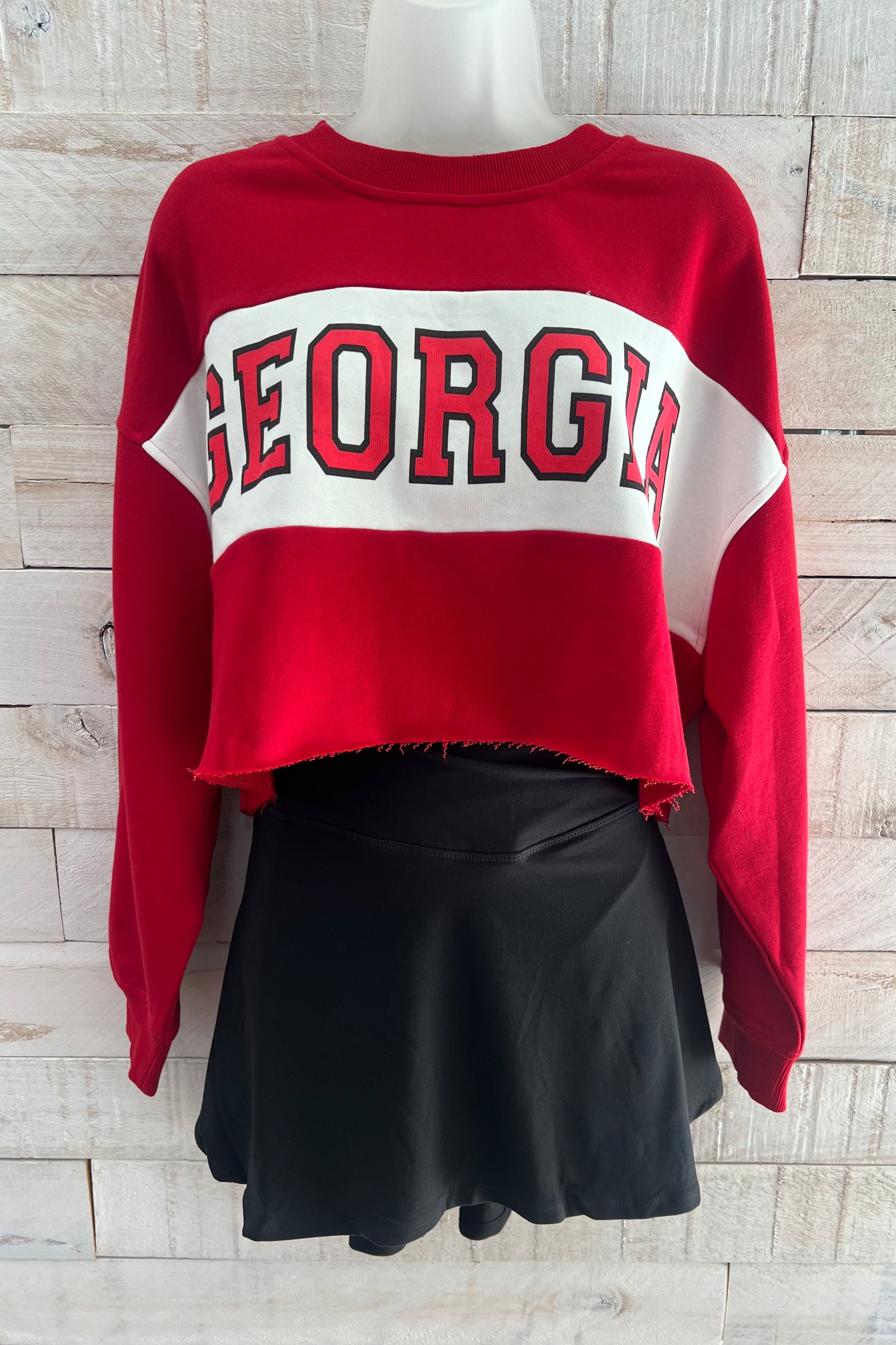 - Red, cropped, sweatshirt that features long sleeves, a round neck line, raw hem detailing and a white color block detail in the middle with "Georgia" written across the front!