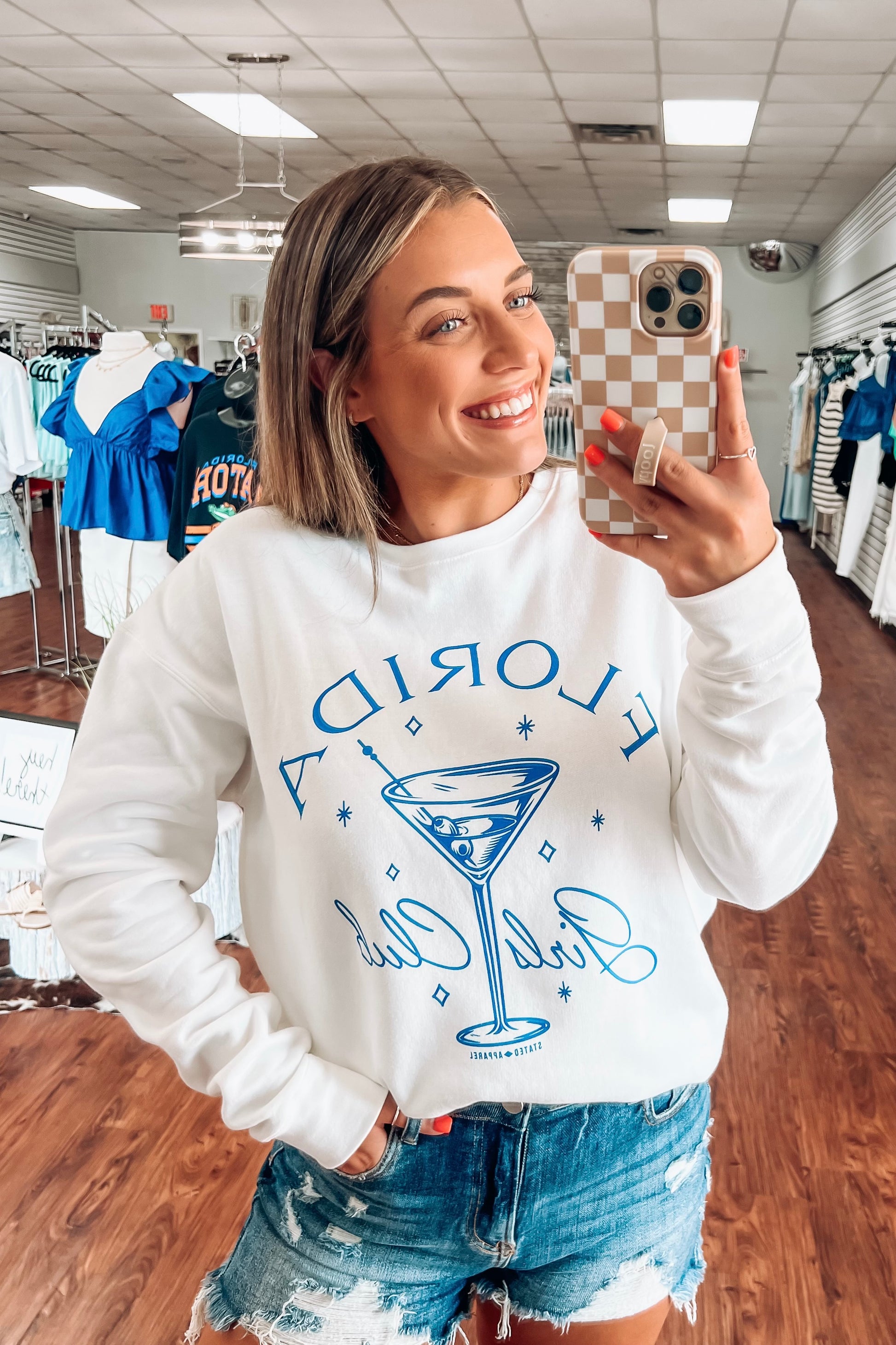- White sweatshirt that features long sleeves, a round neck line and "Florida Girls Club" written on the front with a martini graphic in royal blue!