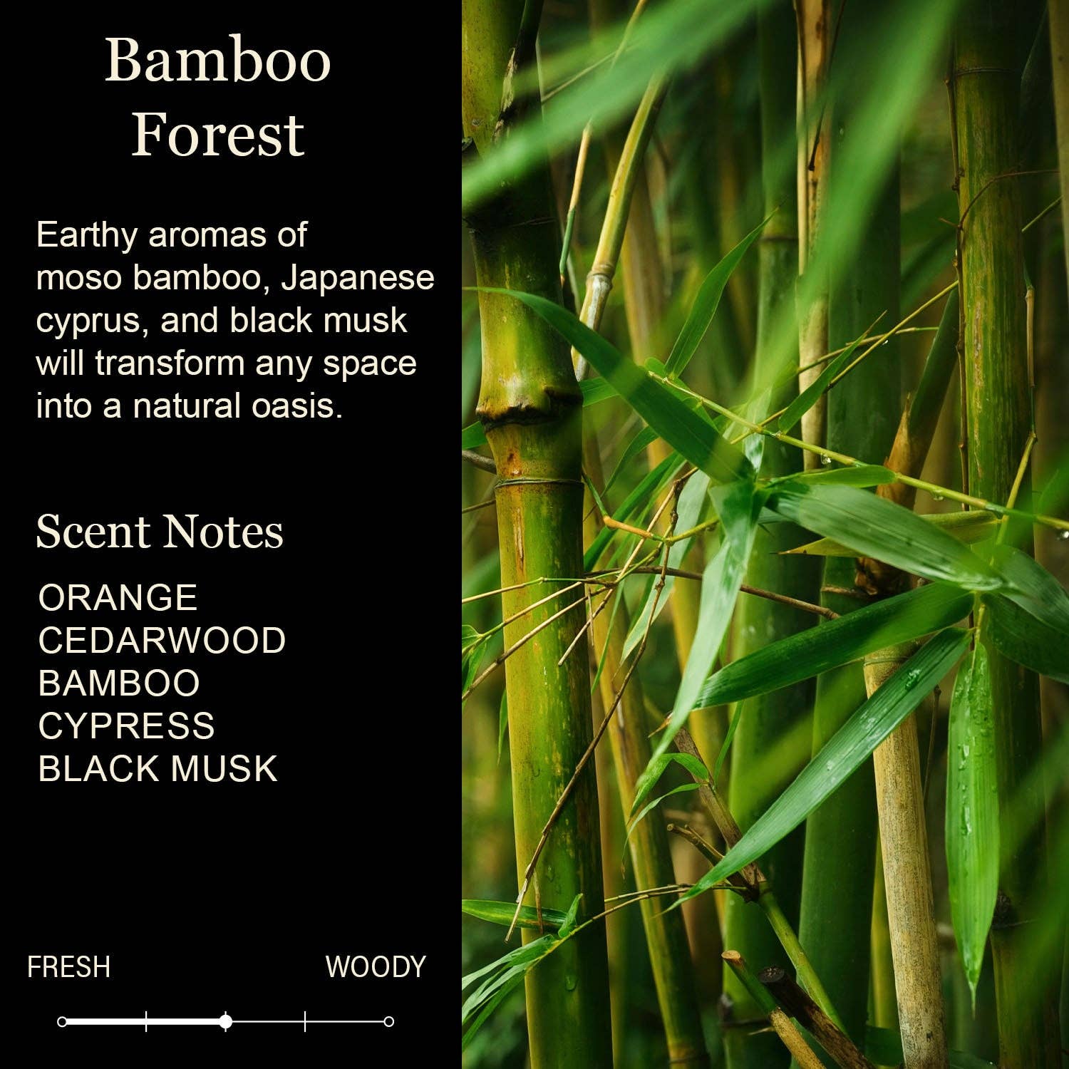 SCENT: #12 Bamboo Forest. This earthy aroma will fill your home with notes of Bamboo, Cypress, and black musk. NOTES: Top: Bamboo Middle: Cypress Bottom: Musk