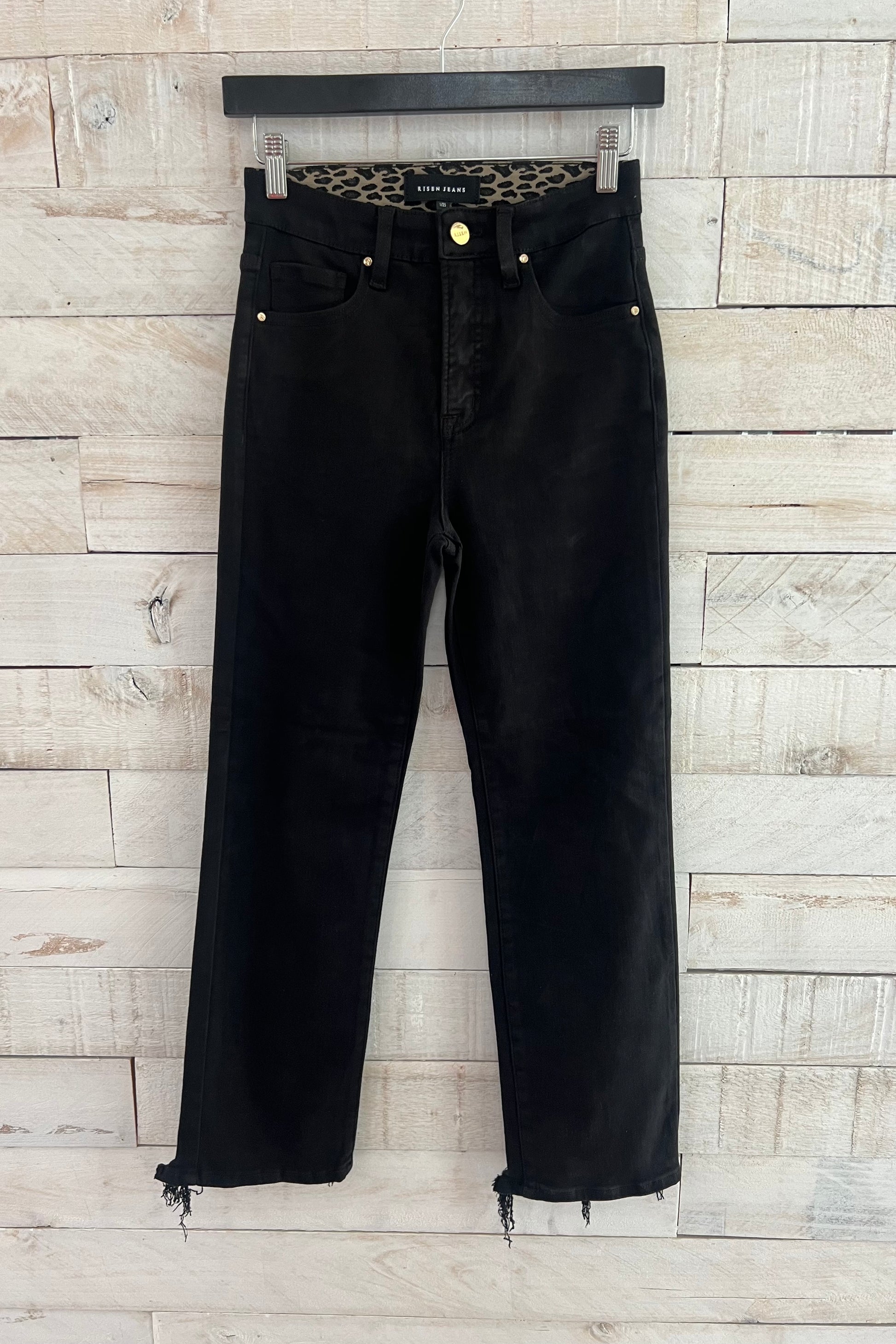 - Black, high rise, straight leg jeans that feature a tummy control waist band and very light destruction on the back ankle!