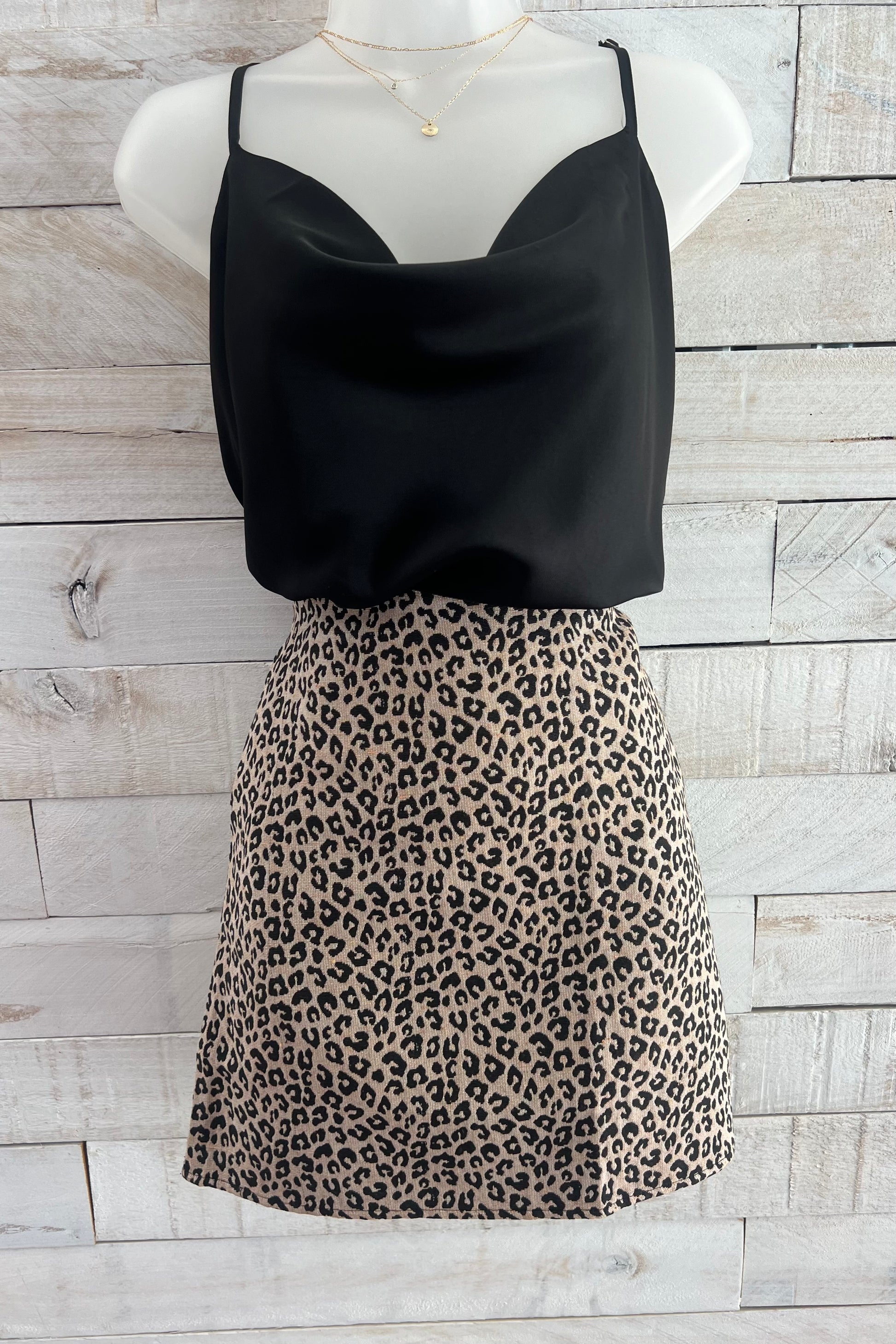 - Tan and black, leopard print, mini skirt that features a back elastic band and side pockets!