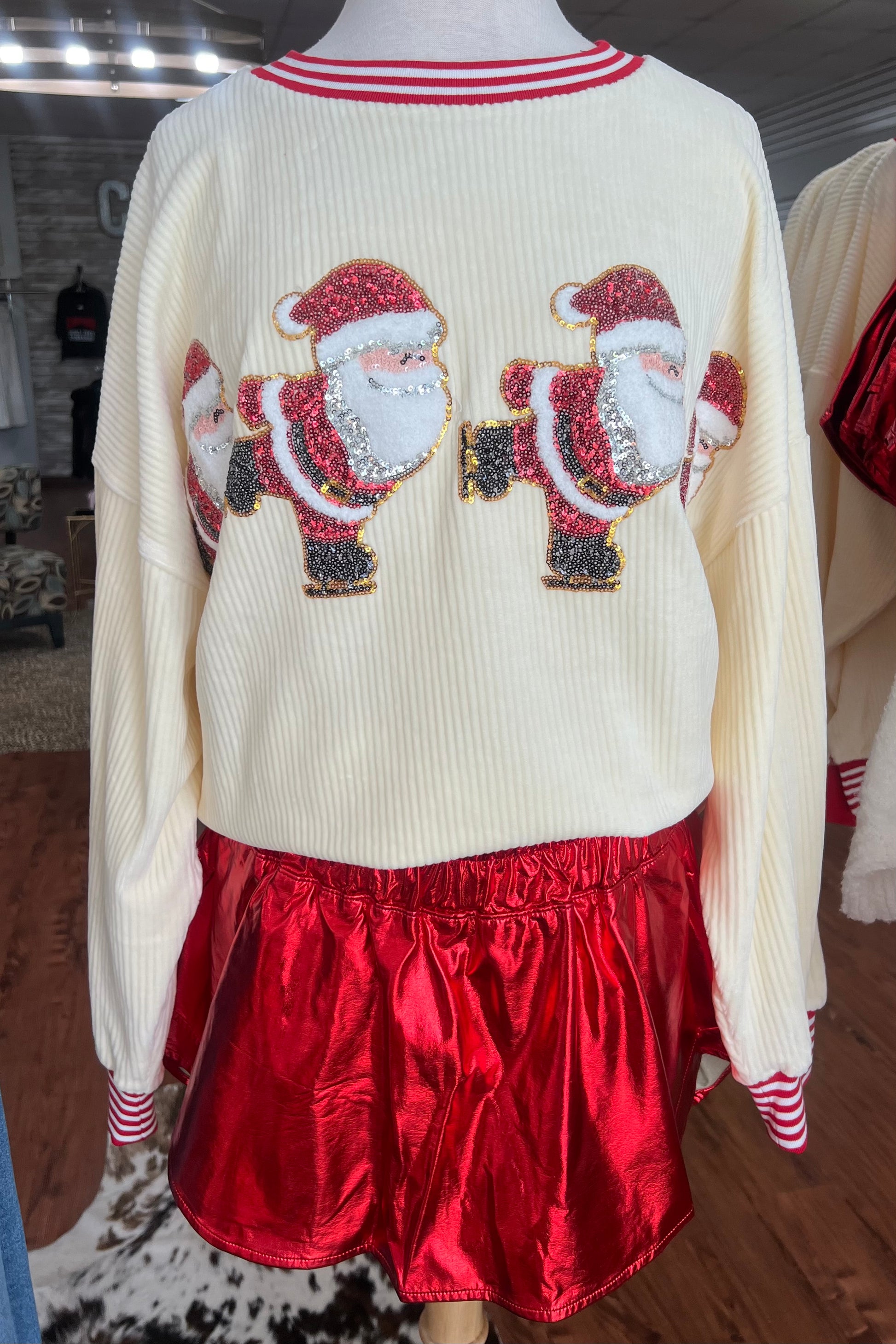 - Red, metallic, mini skort that features an elastic waist band and a high rise fit! Perfect for the holiday season!