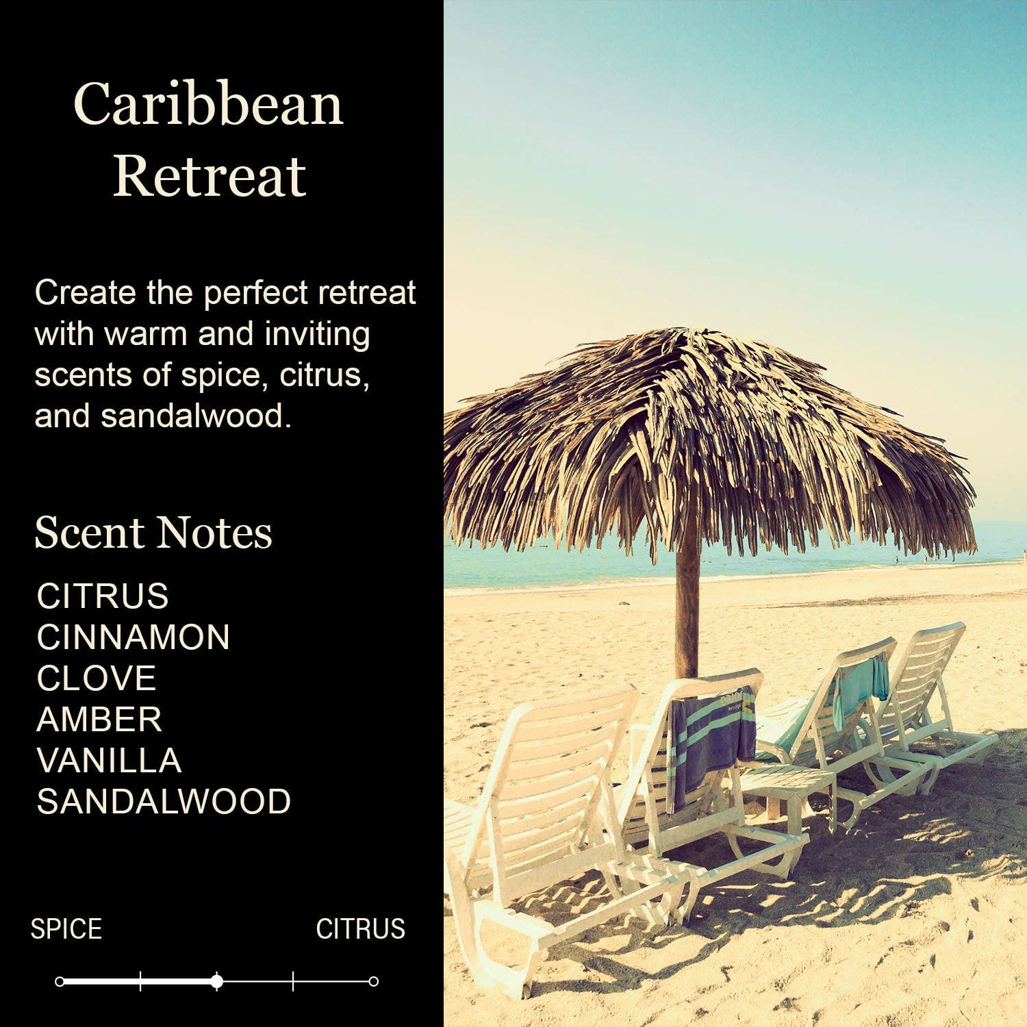 SCENT: #17 Caribbean Retreat. A light scent of citrus with notes of cinnamon and clove is layered on warm amber, vanilla, and sandalwood.