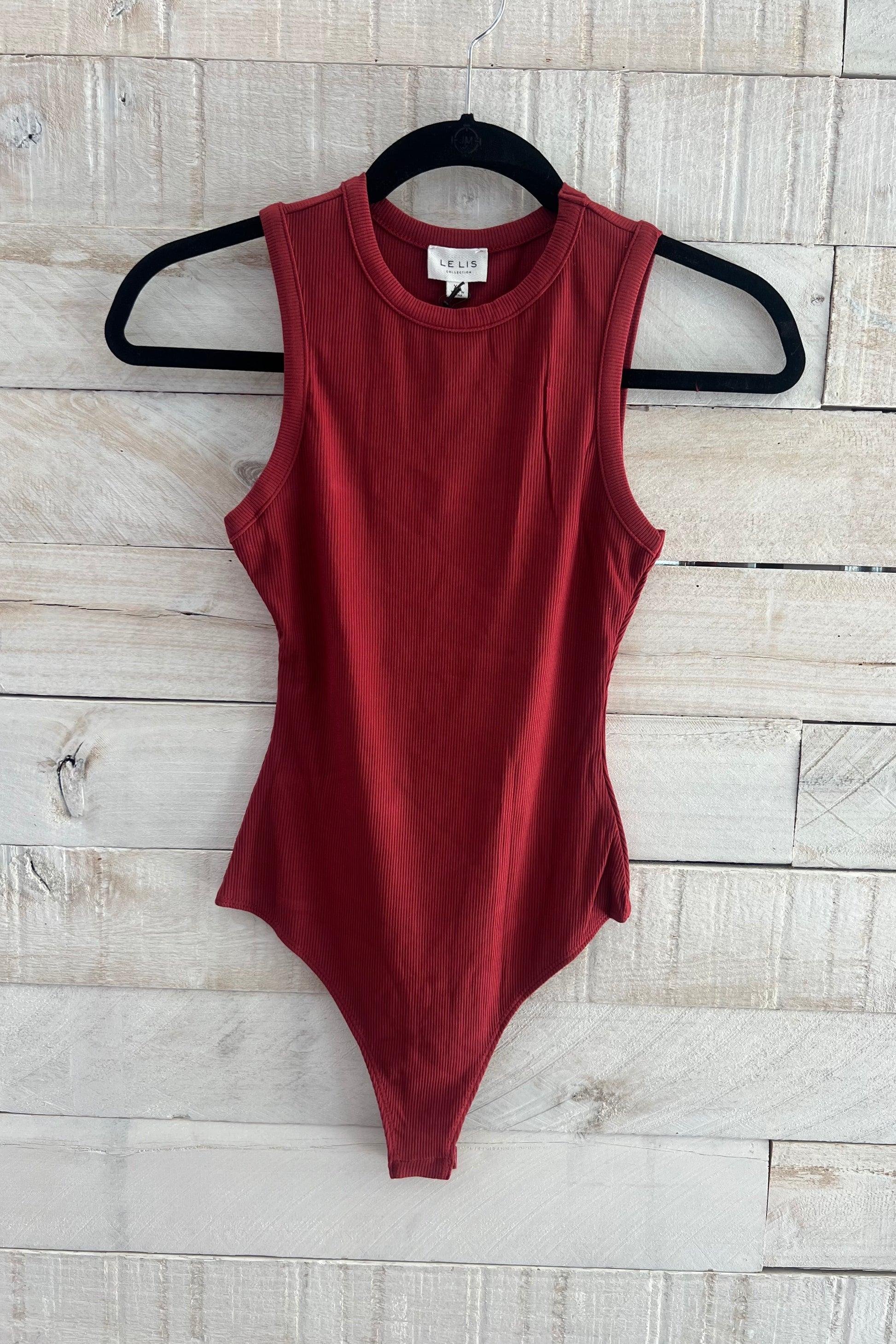 - Black, sleeveless, ribbed bodysuit that features a round neck line and a snap button closure!