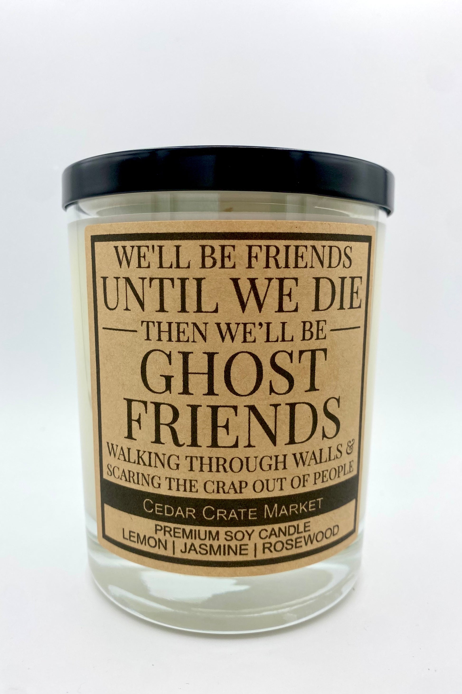 This premium soy candle blends refreshing lemon with delicate jasmine and warm rosewood, creating a balanced and inviting aroma. Adding a humorous twist saying "We'll Be Friends Until We Die Then We'll Be Ghost Friends Walking Through Walls & Scaring The Crap Out Of People" making it a great gift for your best pals. Crafted from high-quality soy wax, it burns cleanly and evenly, providing long-lasting fragrance that enhances any space. Perfect for setting a relaxing mood or gifting to a cherished friend, this candle combines elegance and comfort in one refined package.